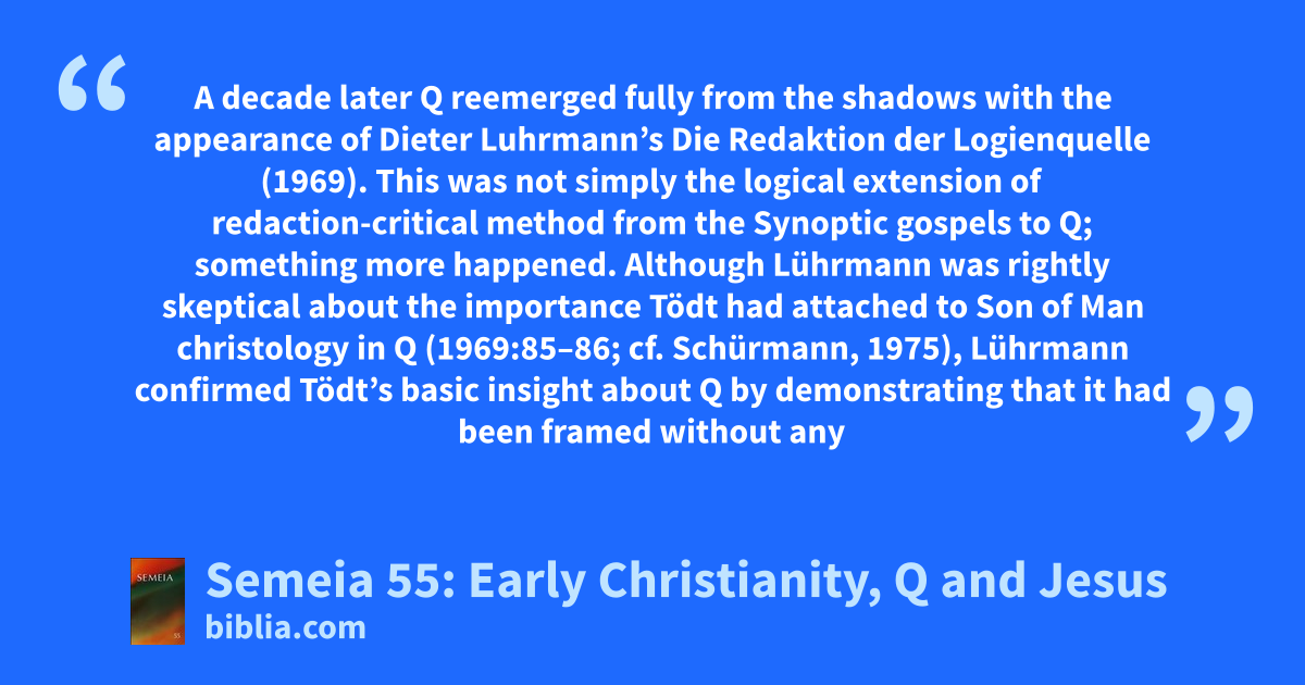 A decade later Q reemerged fully from the shadows with the appearance of Dieter Luhrmann’s Die Redaktion der Logienquelle (1969). This was not simply the logical extension of redaction-critical method from the Synoptic gospels to Q; something more happened. Although Lührmann was rightly skeptical about the importance Tödt had attached to Son of Man christology in Q (1969:85–86; cf. Schürmann, 1975), Lührmann confirmed Tödt’s basic insight about Q by demonstrating that it had been framed without any