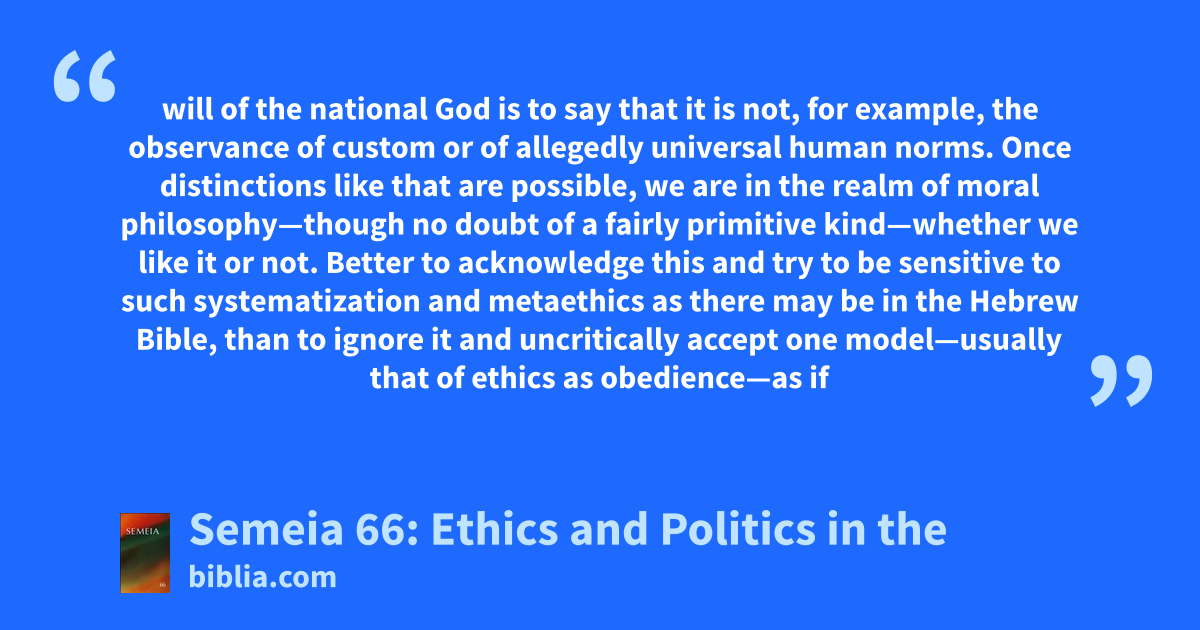 will of the national God is to say that it is not, for example, the observance of custom or of allegedly universal human norms. Once distinctions like that are possible, we are in the realm of moral philosophy—though no doubt of a fairly primitive kind—whether we like it or not. Better to acknowledge this and try to be sensitive to such systematization and metaethics as there may be in the Hebrew Bible, than to ignore it and uncritically accept one model—usually that of ethics as obedience—as if