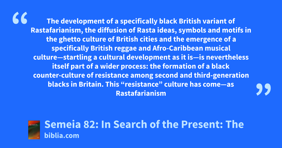 The development of a specifically black British variant of Rastafarianism, the diffusion of Rasta ideas, symbols and motifs in the ghetto culture of British cities and the emergence of a specifically British reggae and Afro-Caribbean musical culture—startling a cultural development as it is—is nevertheless itself part of a wider process: the formation of a black counter-culture of resistance among second and third-generation blacks in Britain. This “resistance” culture has come—as Rastafarianism