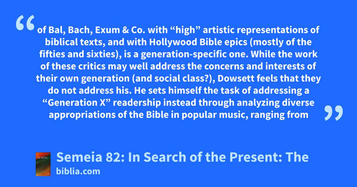 of Bal, Bach, Exum & Co. with “high” artistic representations of biblical texts, and with Hollywood Bible epics (mostly of the fifties and sixties), is a generation-specific one. While the work of these critics may well address the concerns and interests of their own generation (and social class?), Dowsett feels that they do not address his. He sets himself the task of addressing a “Generation X” readership instead through analyzing diverse appropriations of the Bible in popular music, ranging from