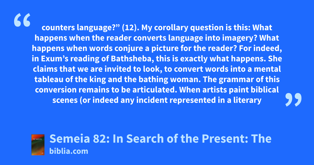 counters language?” (12). My corollary question is this: What happens when the reader converts language into imagery? What happens when words conjure a picture for the reader? For indeed, in Exum’s reading of Bathsheba, this is exactly what happens. She claims that we are invited to look, to convert words into a mental tableau of the king and the bathing woman. The grammar of this conversion remains to be articulated. When artists paint biblical scenes (or indeed any incident represented in a literary