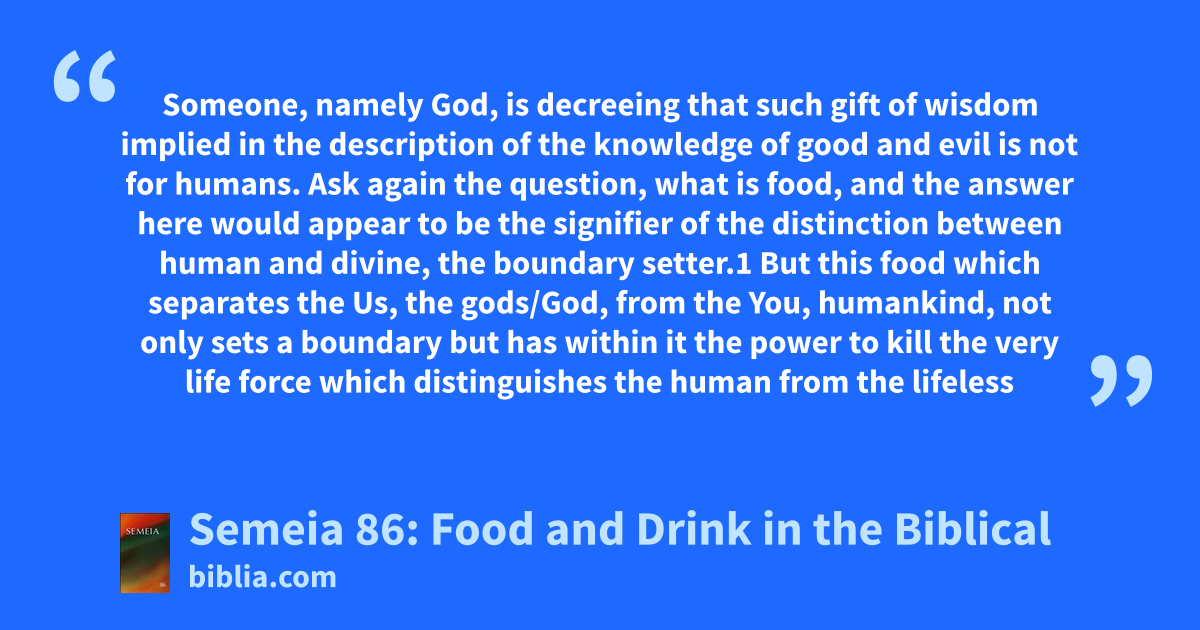 Someone, namely God, is decreeing that such gift of wisdom implied in the description of the knowledge of good and evil is not for humans. Ask again the question, what is food, and the answer here would appear to be the signifier of the distinction between human and divine, the boundary setter.1 But this food which separates the Us, the gods/God, from the You, humankind, not only sets a boundary but has within it the power to kill the very life force which distinguishes the human from the lifeless