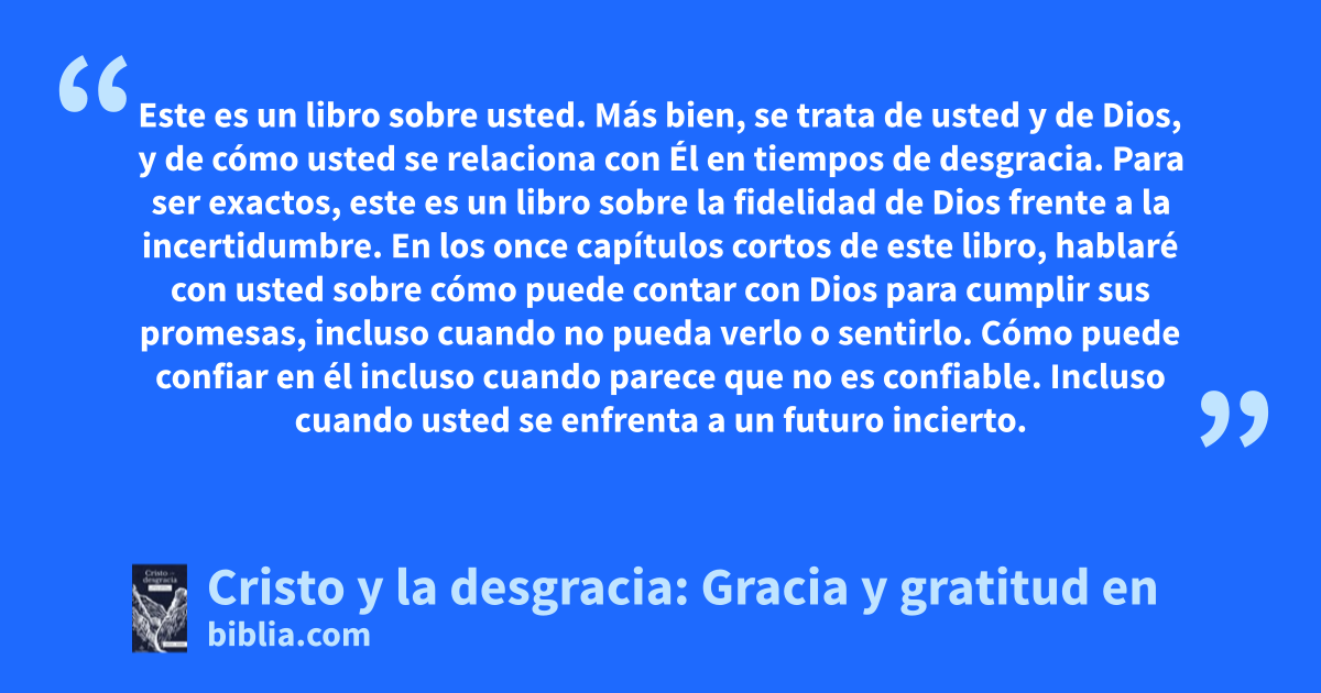 Este es un libro sobre usted. Más bien, se trata de usted y de Dios, y de cómo usted se relaciona con Él en tiempos de desgracia. Para ser exactos, este es un libro sobre la fidelidad de Dios frente a la incertidumbre. En los once capítulos cortos de este libro, hablaré con usted sobre cómo puede contar con Dios para cumplir sus promesas, incluso cuando no pueda verlo o sentirlo. Cómo puede confiar en él incluso cuando parece que no es confiable. Incluso cuando usted se enfrenta a un futuro incierto.