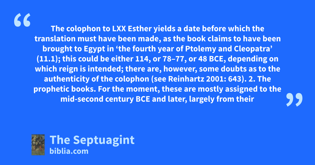 The colophon to LXX Esther yields a date before which the translation must have been made, as the book claims to have been brought to Egypt in ‘the fourth year of Ptolemy and Cleopatra’ (11.1); this could be either 114, or 78–77, or 48 BCE, depending on which reign is intended; there are, however, some doubts as to the authenticity of the colophon (see Reinhartz 2001: 643). 2. The prophetic books. For the moment, these are mostly assigned to the mid-second century BCE and later, largely from their