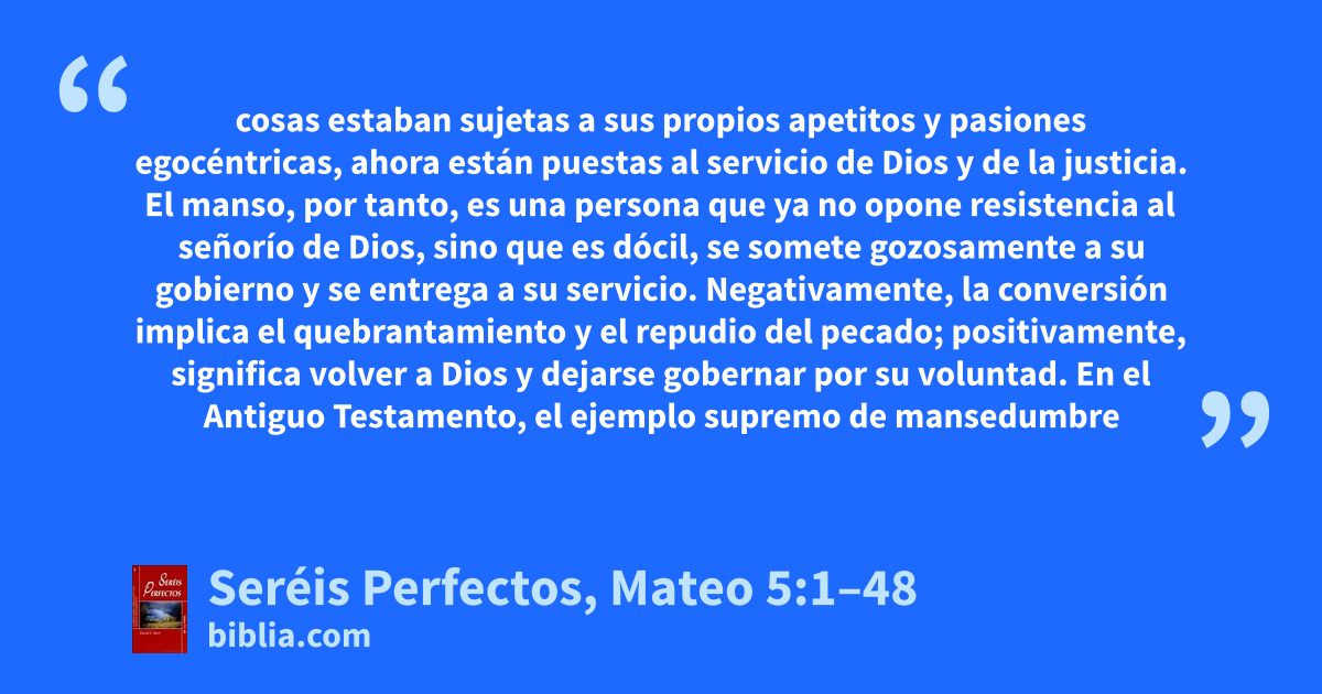 cosas estaban sujetas a sus propios apetitos y pasiones egocéntricas, ahora están puestas al servicio de Dios y de la justicia. El manso, por tanto, es una persona que ya no opone resistencia al señorío de Dios, sino que es dócil, se somete gozosamente a su gobierno y se entrega a su servicio. Negativamente, la conversión implica el quebrantamiento y el repudio del pecado; positivamente, significa volver a Dios y dejarse gobernar por su voluntad. En el Antiguo Testamento, el ejemplo supremo de mansedumbre