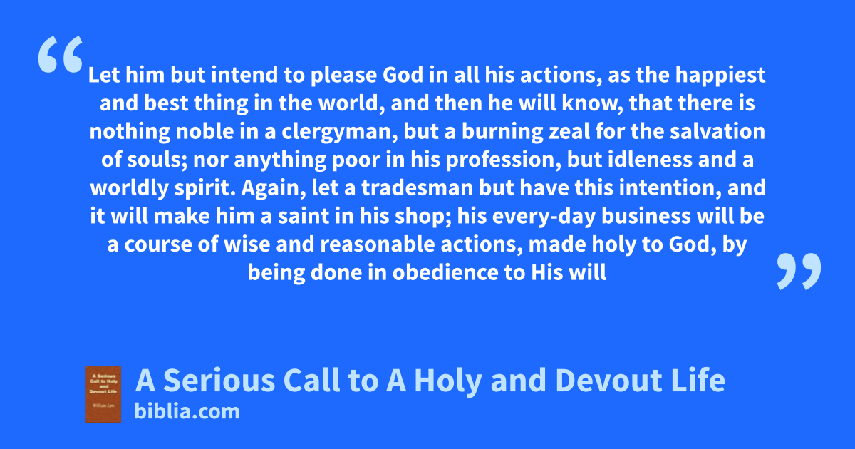 Let him but intend to please God in all his actions, as the happiest and best thing in the world, and then he will know, that there is nothing noble in a clergyman, but a burning zeal for the salvation of souls; nor anything poor in his profession, but idleness and a worldly spirit. Again, let a tradesman but have this intention, and it will make him a saint in his shop; his every-day business will be a course of wise and reasonable actions, made holy to God, by being done in obedience to His will