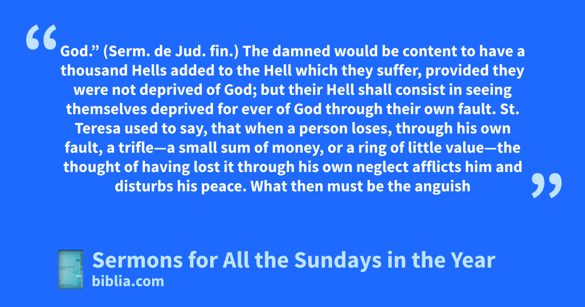 God.” (Serm. de Jud. fin.) The damned would be content to have a thousand Hells added to the Hell which they suffer, provided they were not deprived of God; but their Hell shall consist in seeing themselves deprived for ever of God through their own fault. St. Teresa used to say, that when a person loses, through his own fault, a trifle—a small sum of money, or a ring of little value—the thought of having lost it through his own neglect afflicts him and disturbs his peace. What then must be the anguish