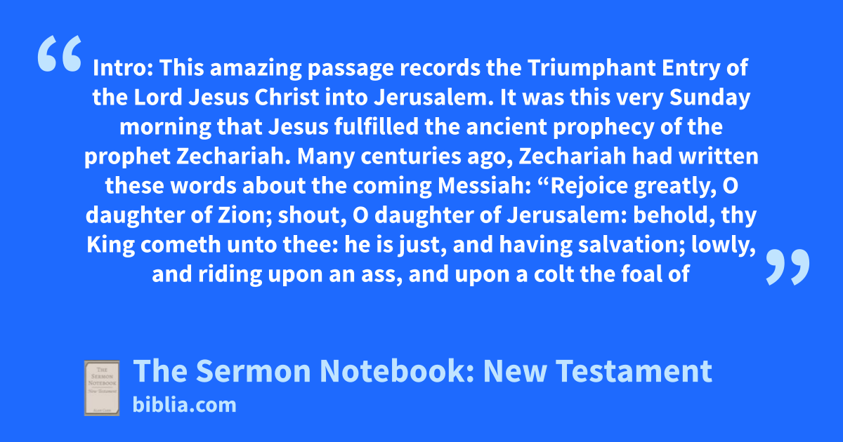 Intro: This amazing passage records the Triumphant Entry of the Lord Jesus Christ into Jerusalem. It was this very Sunday morning that Jesus fulfilled the ancient prophecy of the prophet Zechariah. Many centuries ago, Zechariah had written these words about the coming Messiah: “Rejoice greatly, O daughter of Zion; shout, O daughter of Jerusalem: behold, thy King cometh unto thee: he is just, and having salvation; lowly, and riding upon an ass, and upon a colt the foal of