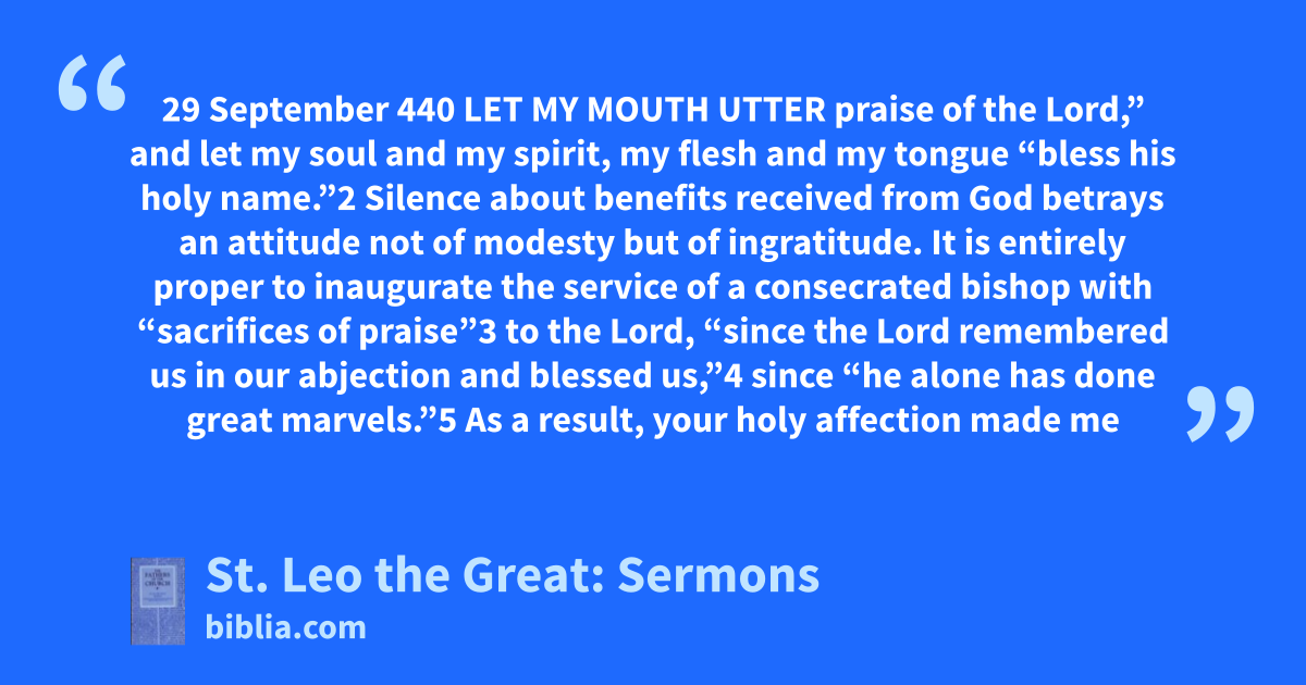 29 September 440 LET MY MOUTH UTTER praise of the Lord,” and let my soul and my spirit, my flesh and my tongue “bless his holy name.”2 Silence about benefits received from God betrays an attitude not of modesty but of ingratitude. It is entirely proper to inaugurate the service of a consecrated bishop with “sacrifices of praise”3 to the Lord, “since the Lord remembered us in our abjection and blessed us,”4 since “he alone has done great marvels.”5 As a result, your holy affection made me