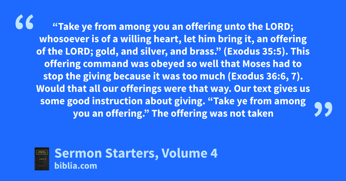 “Take ye from among you an offering unto the LORD; whosoever is of a willing heart, let him bring it, an offering of the LORD; gold, and silver, and brass.” (Exodus 35:5). This offering command was obeyed so well that Moses had to stop the giving because it was too much (Exodus 36:6, 7). Would that all our offerings were that way. Our text gives us some good instruction about giving. “Take ye from among you an offering.” The offering was not taken
