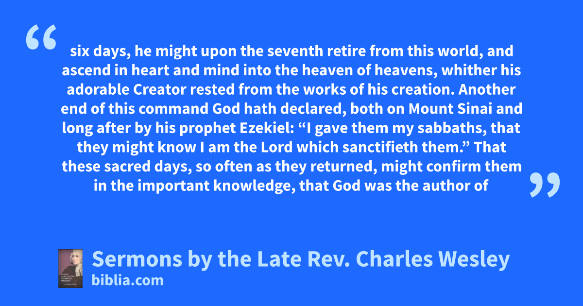 six days, he might upon the seventh retire from this world, and ascend in heart and mind into the heaven of heavens, whither his adorable Creator rested from the works of his creation. Another end of this command God hath declared, both on Mount Sinai and long after by his prophet Ezekiel: “I gave them my sabbaths, that they might know I am the Lord which sanctifieth them.” That these sacred days, so often as they returned, might confirm them in the important knowledge, that God was the author of