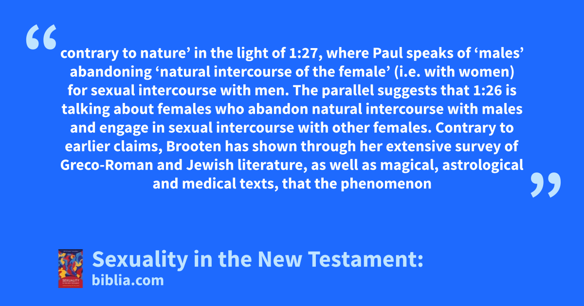 contrary to nature’ in the light of 1:27, where Paul speaks of ‘males’ abandoning ‘natural intercourse of the female’ (i.e. with women) for sexual intercourse with men. The parallel suggests that 1:26 is talking about females who abandon natural intercourse with males and engage in sexual intercourse with other females. Contrary to earlier claims, Brooten has shown through her extensive survey of Greco-Roman and Jewish literature, as well as magical, astrological and medical texts, that the phenomenon