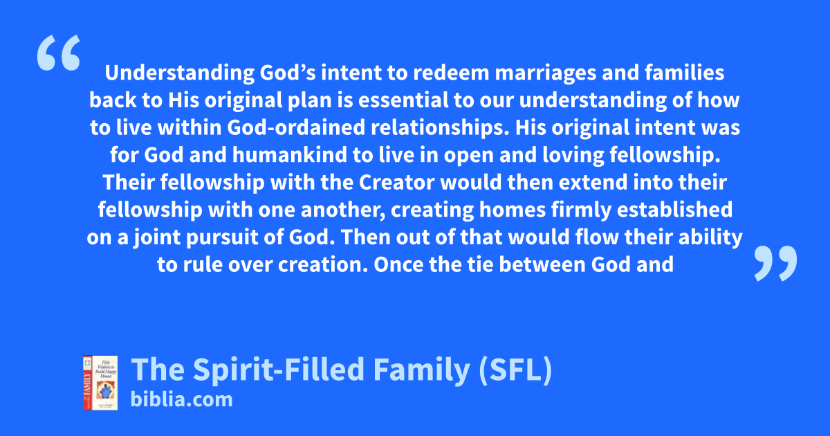 Understanding God’s intent to redeem marriages and families back to His original plan is essential to our understanding of how to live within God-ordained relationships. His original intent was for God and humankind to live in open and loving fellowship. Their fellowship with the Creator would then extend into their fellowship with one another, creating homes firmly established on a joint pursuit of God. Then out of that would flow their ability to rule over creation. Once the tie between God and