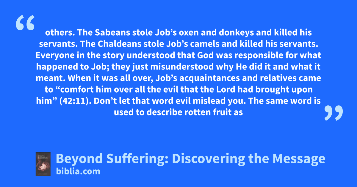 others. The Sabeans stole Job’s oxen and donkeys and killed his servants. The Chaldeans stole Job’s camels and killed his servants. Everyone in the story understood that God was responsible for what happened to Job; they just misunderstood why He did it and what it meant. When it was all over, Job’s acquaintances and relatives came to “comfort him over all the evil that the Lord had brought upon him” (42:11). Don’t let that word evil mislead you. The same word is used to describe rotten fruit as