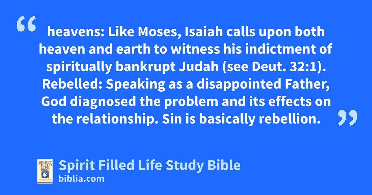 heavens: Like Moses, Isaiah calls upon both heaven and earth to witness his indictment of spiritually bankrupt Judah (see Deut. 32:1). Rebelled: Speaking as a disappointed Father, God diagnosed the problem and its effects on the relationship. Sin is basically rebellion.