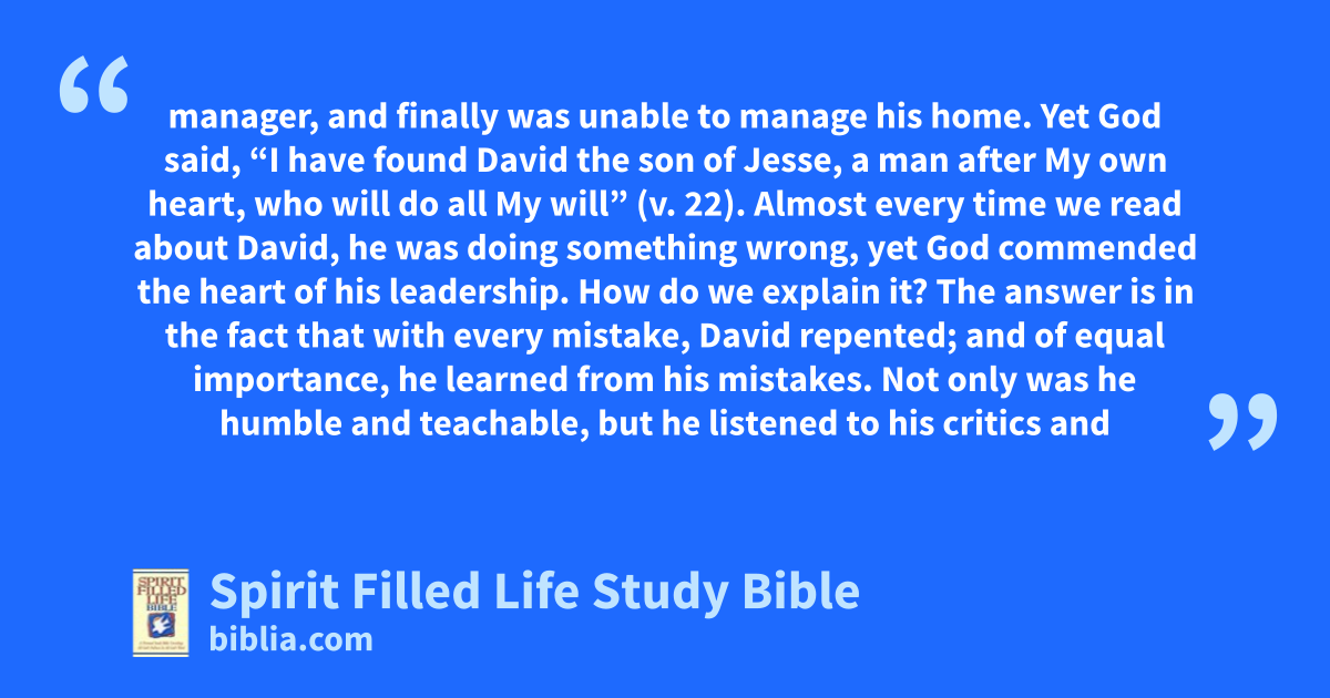 manager, and finally was unable to manage his home. Yet God said, “I have found David the son of Jesse, a man after My own heart, who will do all My will” (v. 22). Almost every time we read about David, he was doing something wrong, yet God commended the heart of his leadership. How do we explain it? The answer is in the fact that with every mistake, David repented; and of equal importance, he learned from his mistakes. Not only was he humble and teachable, but he listened to his critics and