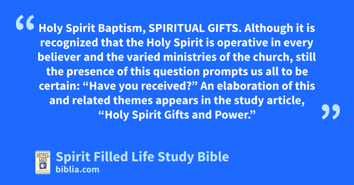 Holy Spirit Baptism, SPIRITUAL GIFTS. Although it is recognized that the Holy Spirit is operative in every believer and the varied ministries of the church, still the presence of this question prompts us all to be certain: “Have you received?” An elaboration of this and related themes appears in the study article, “Holy Spirit Gifts and Power.”
