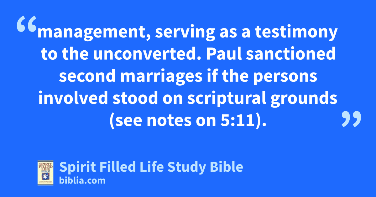 management, serving as a testimony to the unconverted. Paul sanctioned second marriages if the persons involved stood on scriptural grounds (see notes on 5:11).