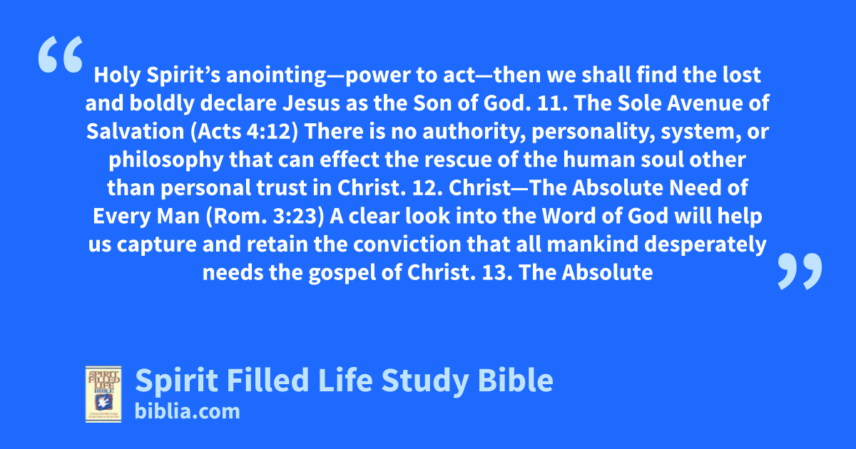 Holy Spirit’s anointing—power to act—then we shall find the lost and boldly declare Jesus as the Son of God. 11. The Sole Avenue of Salvation (Acts 4:12) There is no authority, personality, system, or philosophy that can effect the rescue of the human soul other than personal trust in Christ. 12. Christ—The Absolute Need of Every Man (Rom. 3:23) A clear look into the Word of God will help us capture and retain the conviction that all mankind desperately needs the gospel of Christ. 13. The Absolute