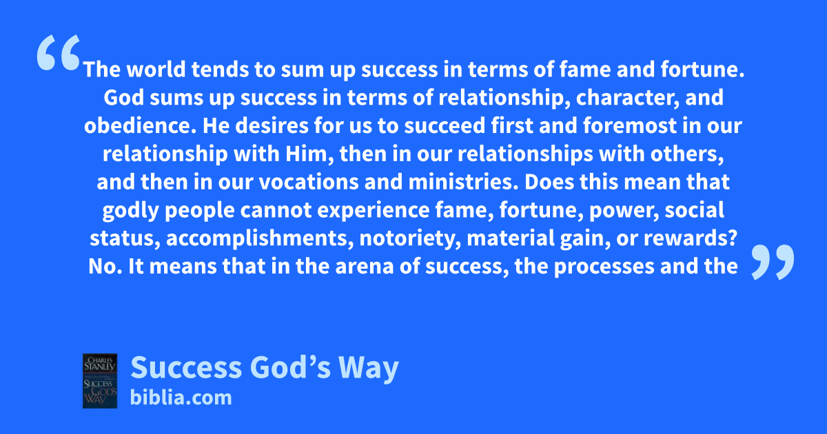The world tends to sum up success in terms of fame and fortune. God sums up success in terms of relationship, character, and obedience. He desires for us to succeed first and foremost in our relationship with Him, then in our relationships with others, and then in our vocations and ministries. Does this mean that godly people cannot experience fame, fortune, power, social status, accomplishments, notoriety, material gain, or rewards? No. It means that in the arena of success, the processes and the