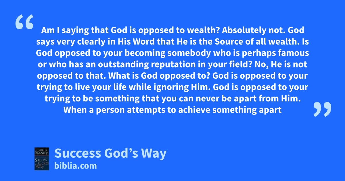 Am I saying that God is opposed to wealth? Absolutely not. God says very clearly in His Word that He is the Source of all wealth. Is God opposed to your becoming somebody who is perhaps famous or who has an outstanding reputation in your field? No, He is not opposed to that. What is God opposed to? God is opposed to your trying to live your life while ignoring Him. God is opposed to your trying to be something that you can never be apart from Him. When a person attempts to achieve something apart