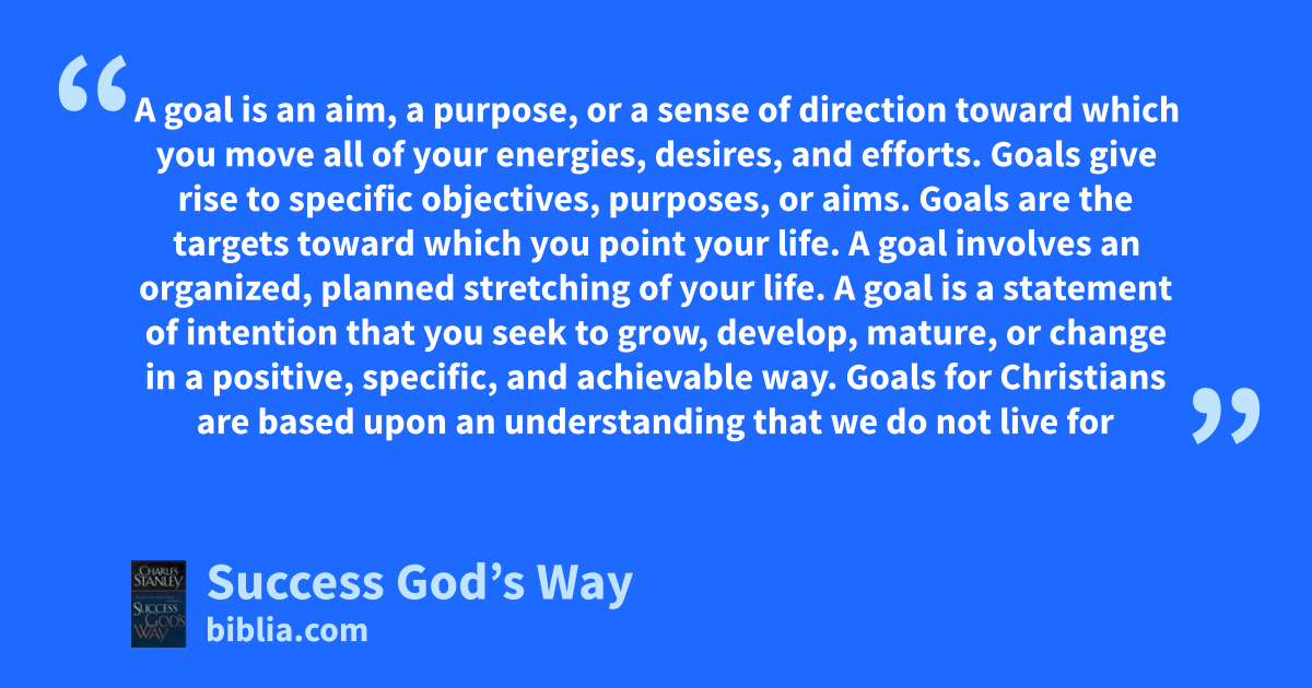 A goal is an aim, a purpose, or a sense of direction toward which you move all of your energies, desires, and efforts. Goals give rise to specific objectives, purposes, or aims. Goals are the targets toward which you point your life. A goal involves an organized, planned stretching of your life. A goal is a statement of intention that you seek to grow, develop, mature, or change in a positive, specific, and achievable way. Goals for Christians are based upon an understanding that we do not live for