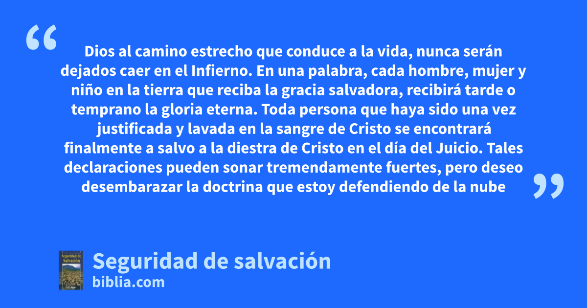 Dios al camino estrecho que conduce a la vida, nunca serán dejados caer en el Infierno. En una palabra, cada hombre, mujer y niño en la tierra que reciba la gracia salvadora, recibirá tarde o temprano la gloria eterna. Toda persona que haya sido una vez justificada y lavada en la sangre de Cristo se encontrará finalmente a salvo a la diestra de Cristo en el día del Juicio. Tales declaraciones pueden sonar tremendamente fuertes, pero deseo desembarazar la doctrina que estoy defendiendo de la nube