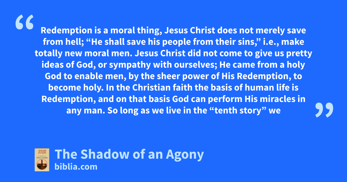 Redemption is a moral thing, Jesus Christ does not merely save from hell; “He shall save his people from their sins,” i.e., make totally new moral men. Jesus Christ did not come to give us pretty ideas of God, or sympathy with ourselves; He came from a holy God to enable men, by the sheer power of His Redemption, to become holy. In the Christian faith the basis of human life is Redemption, and on that basis God can perform His miracles in any man. So long as we live in the “tenth story” we