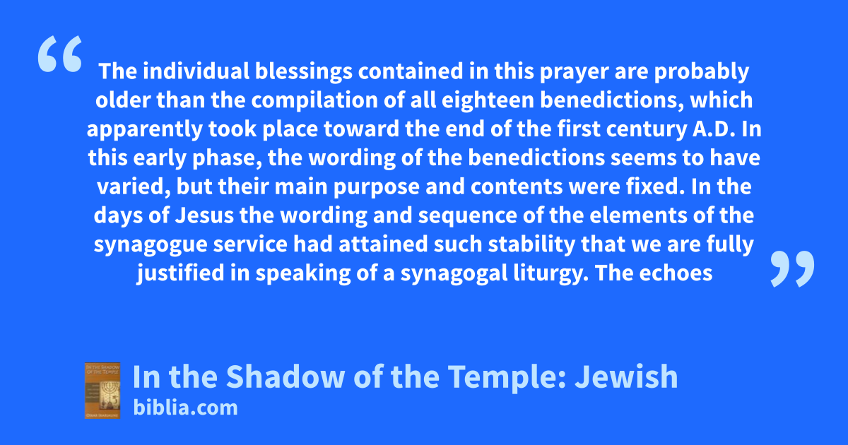 The individual blessings contained in this prayer are probably older than the compilation of all eighteen benedictions, which apparently took place toward the end of the first century A.D. In this early phase, the wording of the benedictions seems to have varied, but their main purpose and contents were fixed. In the days of Jesus the wording and sequence of the elements of the synagogue service had attained such stability that we are fully justified in speaking of a synagogal liturgy. The echoes