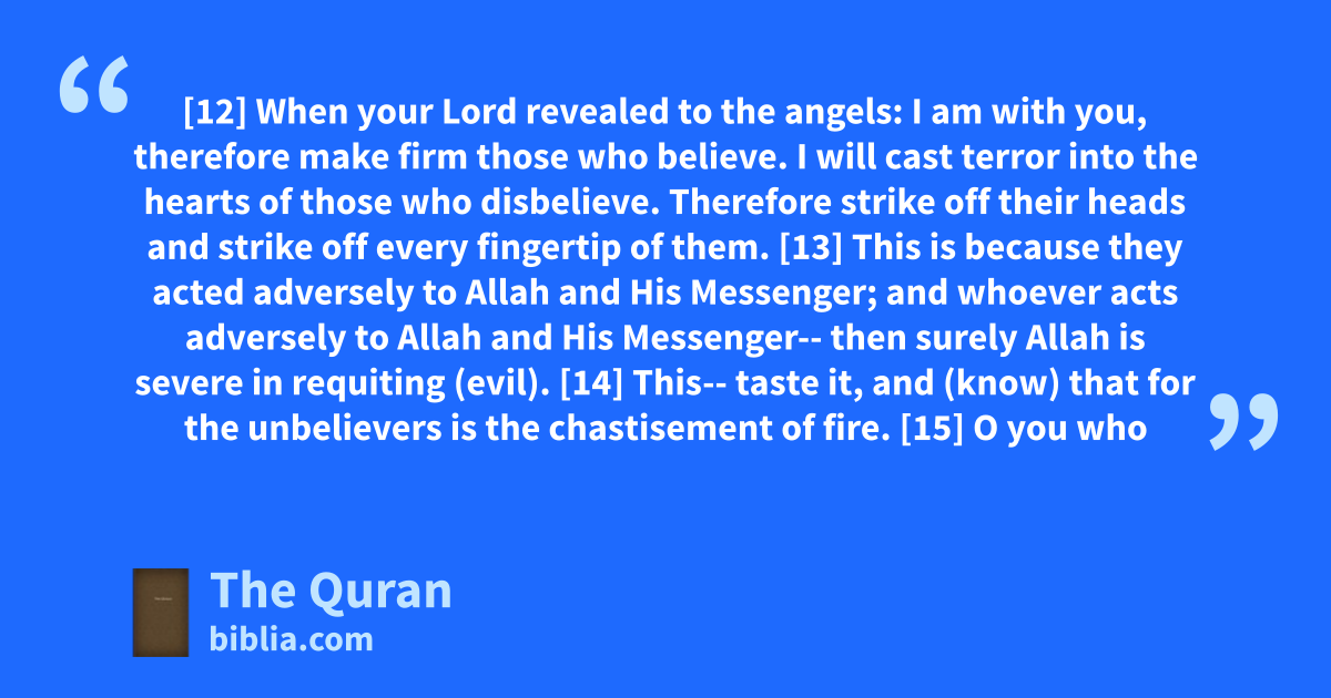 [12] When your Lord revealed to the angels: I am with you, therefore make firm those who believe. I will cast terror into the hearts of those who disbelieve. Therefore strike off their heads and strike off every fingertip of them. [13] This is because they acted adversely to Allah and His Messenger; and whoever acts adversely to Allah and His Messenger-- then surely Allah is severe in requiting (evil). [14] This-- taste it, and (know) that for the unbelievers is the chastisement of fire. [15] O you who