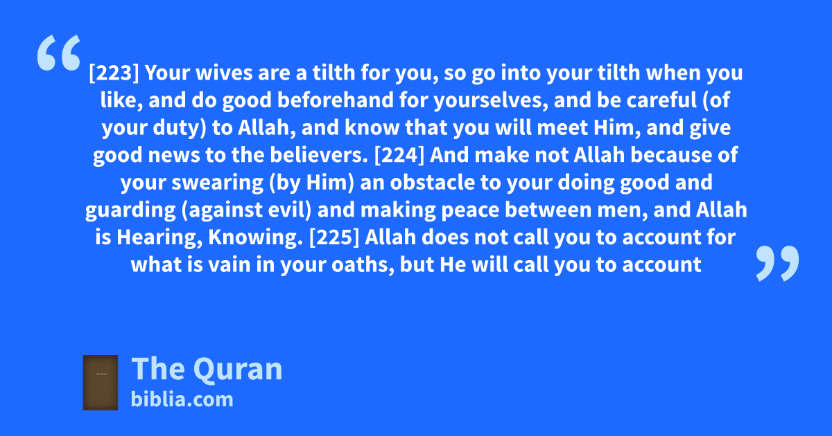 [223] Your wives are a tilth for you, so go into your tilth when you like, and do good beforehand for yourselves, and be careful (of your duty) to Allah, and know that you will meet Him, and give good news to the believers. [224] And make not Allah because of your swearing (by Him) an obstacle to your doing good and guarding (against evil) and making peace between men, and Allah is Hearing, Knowing. [225] Allah does not call you to account for what is vain in your oaths, but He will call you to account