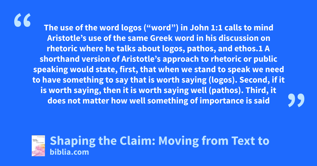 The use of the word logos (“word”) in John 1:1 calls to mind Aristotle’s use of the same Greek word in his discussion on rhetoric where he talks about logos, pathos, and ethos.1 A shorthand version of Aristotle’s approach to rhetoric or public speaking would state, first, that when we stand to speak we need to have something to say that is worth saying (logos). Second, if it is worth saying, then it is worth saying well (pathos). Third, it does not matter how well something of importance is said