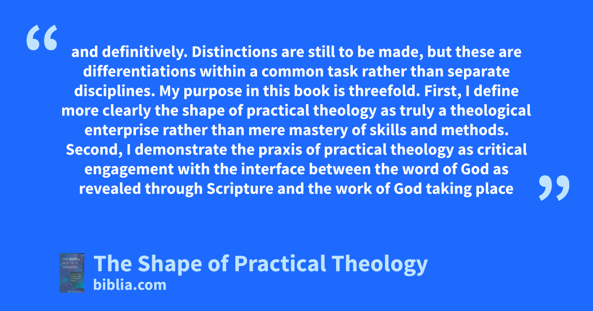 and definitively. Distinctions are still to be made, but these are differentiations within a common task rather than separate disciplines. My purpose in this book is threefold. First, I define more clearly the shape of practical theology as truly a theological enterprise rather than mere mastery of skills and methods. Second, I demonstrate the praxis of practical theology as critical engagement with the interface between the word of God as revealed through Scripture and the work of God taking place