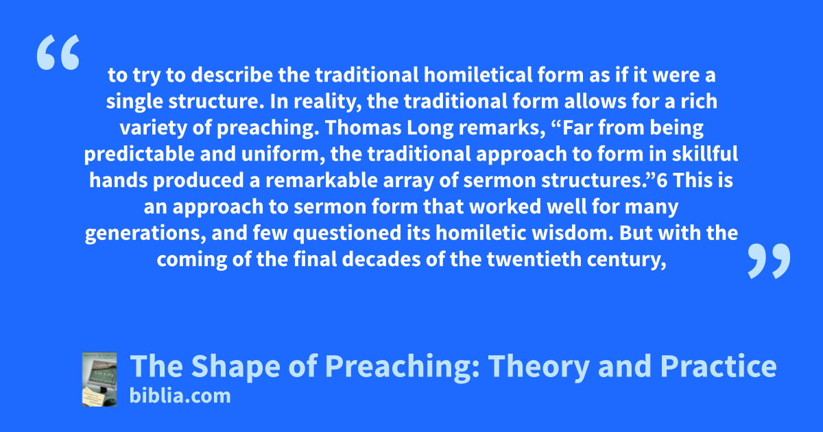 to try to describe the traditional homiletical form as if it were a single structure. In reality, the traditional form allows for a rich variety of preaching. Thomas Long remarks, “Far from being predictable and uniform, the traditional approach to form in skillful hands produced a remarkable array of sermon structures.”6 This is an approach to sermon form that worked well for many generations, and few questioned its homiletic wisdom. But with the coming of the final decades of the twentieth century,