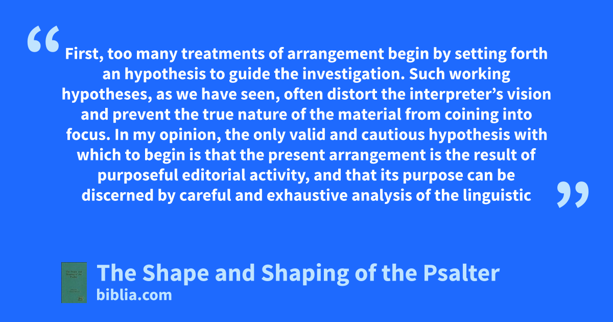 First, too many treatments of arrangement begin by setting forth an hypothesis to guide the investigation. Such working hypotheses, as we have seen, often distort the interpreter’s vision and prevent the true nature of the material from coining into focus. In my opinion, the only valid and cautious hypothesis with which to begin is that the present arrangement is the result of purposeful editorial activity, and that its purpose can be discerned by careful and exhaustive analysis of the linguistic