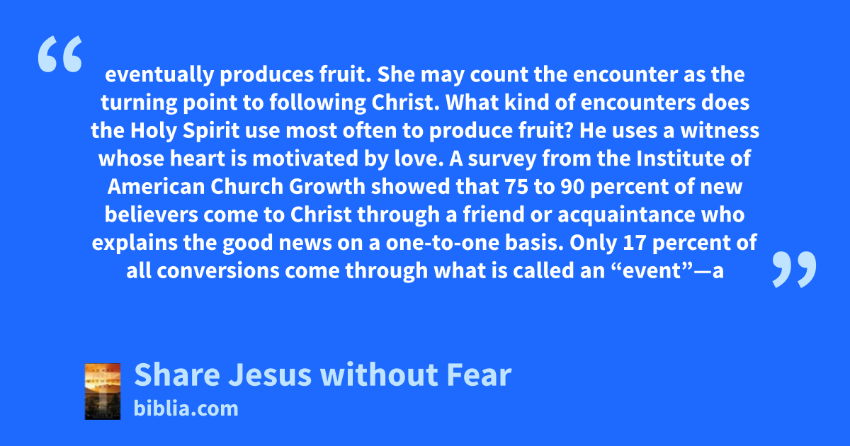 eventually produces fruit. She may count the encounter as the turning point to following Christ. What kind of encounters does the Holy Spirit use most often to produce fruit? He uses a witness whose heart is motivated by love. A survey from the Institute of American Church Growth showed that 75 to 90 percent of new believers come to Christ through a friend or acquaintance who explains the good news on a one-to-one basis. Only 17 percent of all conversions come through what is called an “event”—a