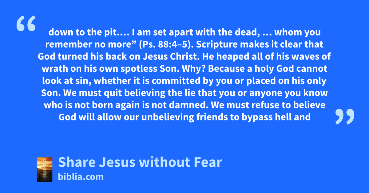 down to the pit.… I am set apart with the dead, … whom you remember no more” (Ps. 88:4–5). Scripture makes it clear that God turned his back on Jesus Christ. He heaped all of his waves of wrath on his own spotless Son. Why? Because a holy God cannot look at sin, whether it is committed by you or placed on his only Son. We must quit believing the lie that you or anyone you know who is not born again is not damned. We must refuse to believe God will allow our unbelieving friends to bypass hell and