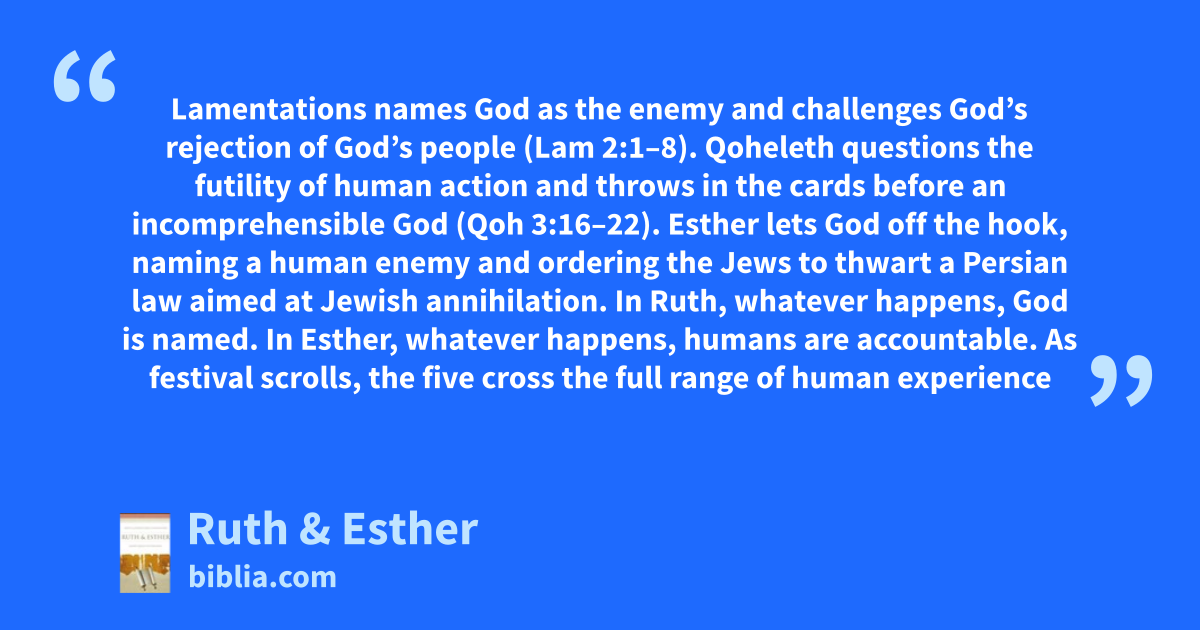 Lamentations names God as the enemy and challenges God’s rejection of God’s people (Lam 2:1–8). Qoheleth questions the futility of human action and throws in the cards before an incomprehensible God (Qoh 3:16–22). Esther lets God off the hook, naming a human enemy and ordering the Jews to thwart a Persian law aimed at Jewish annihilation. In Ruth, whatever happens, God is named. In Esther, whatever happens, humans are accountable. As festival scrolls, the five cross the full range of human experience