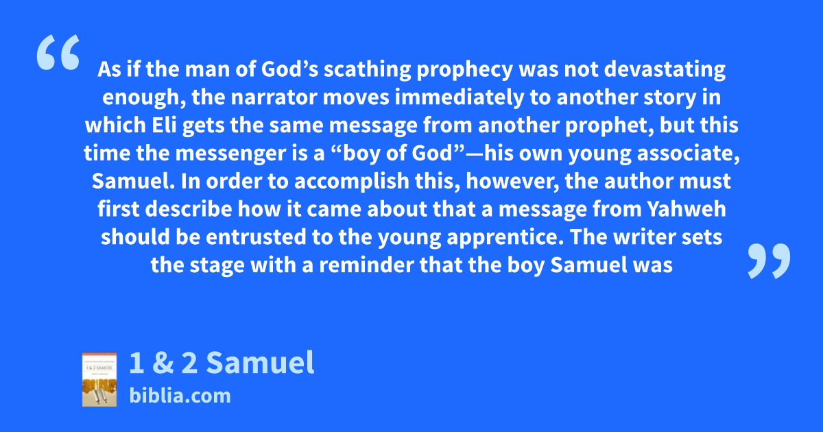 As if the man of God’s scathing prophecy was not devastating enough, the narrator moves immediately to another story in which Eli gets the same message from another prophet, but this time the messenger is a “boy of God”—his own young associate, Samuel. In order to accomplish this, however, the author must first describe how it came about that a message from Yahweh should be entrusted to the young apprentice. The writer sets the stage with a reminder that the boy Samuel was