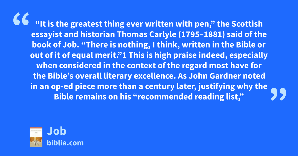 “It is the greatest thing ever written with pen,” the Scottish essayist and historian Thomas Carlyle (1795–1881) said of the book of Job. “There is nothing, I think, written in the Bible or out of it of equal merit.”1 This is high praise indeed, especially when considered in the context of the regard most have for the Bible’s overall literary excellence. As John Gardner noted in an op-ed piece more than a century later, justifying why the Bible remains on his “recommended reading list,”