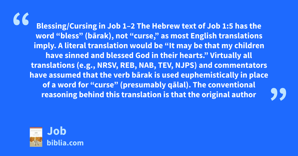Blessing/Cursing in Job 1–2 The Hebrew text of Job 1:5 has the word “bless” (bārak), not “curse,” as most English translations imply. A literal translation would be “It may be that my children have sinned and blessed God in their hearts.” Virtually all translations (e.g., NRSV, REB, NAB, TEV, NJPS) and commentators have assumed that the verb bārak is used euphemistically in place of a word for “curse” (presumably qālal). The conventional reasoning behind this translation is that the original author