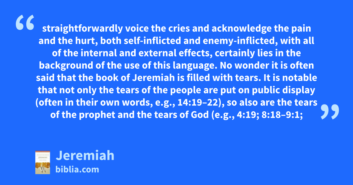 straightforwardly voice the cries and acknowledge the pain and the hurt, both self-inflicted and enemy-inflicted, with all of the internal and external effects, certainly lies in the background of the use of this language. No wonder it is often said that the book of Jeremiah is filled with tears. It is notable that not only the tears of the people are put on public display (often in their own words, e.g., 14:19–22), so also are the tears of the prophet and the tears of God (e.g., 4:19; 8:18–9:1;