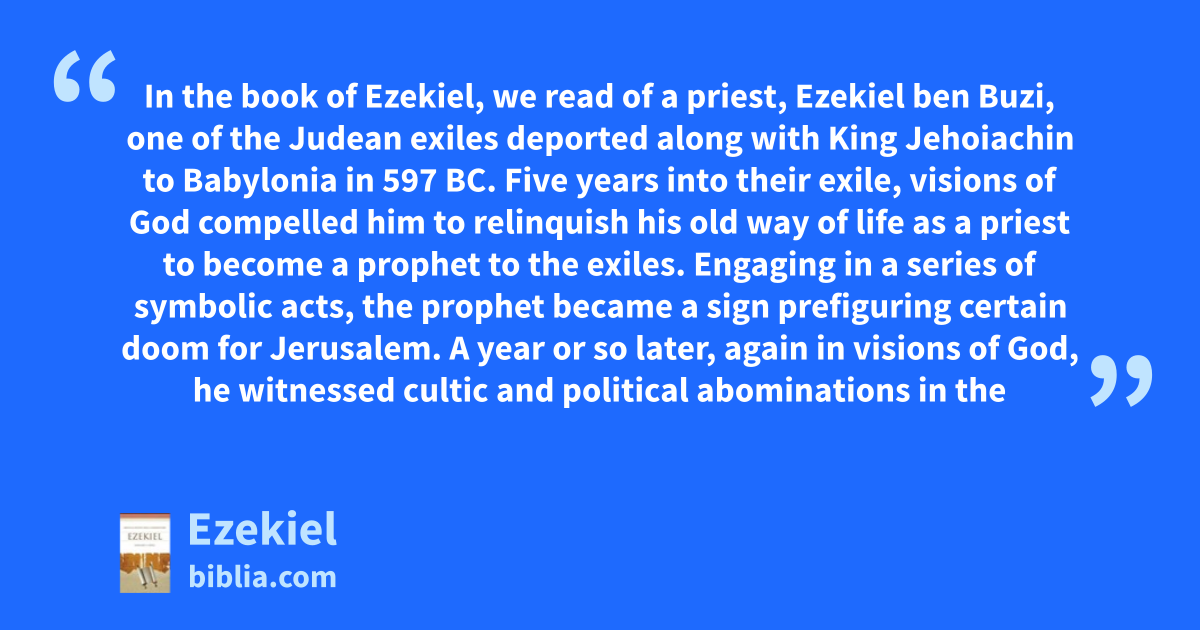 In the book of Ezekiel, we read of a priest, Ezekiel ben Buzi, one of the Judean exiles deported along with King Jehoiachin to Babylonia in 597 BC. Five years into their exile, visions of God compelled him to relinquish his old way of life as a priest to become a prophet to the exiles. Engaging in a series of symbolic acts, the prophet became a sign prefiguring certain doom for Jerusalem. A year or so later, again in visions of God, he witnessed cultic and political abominations in the