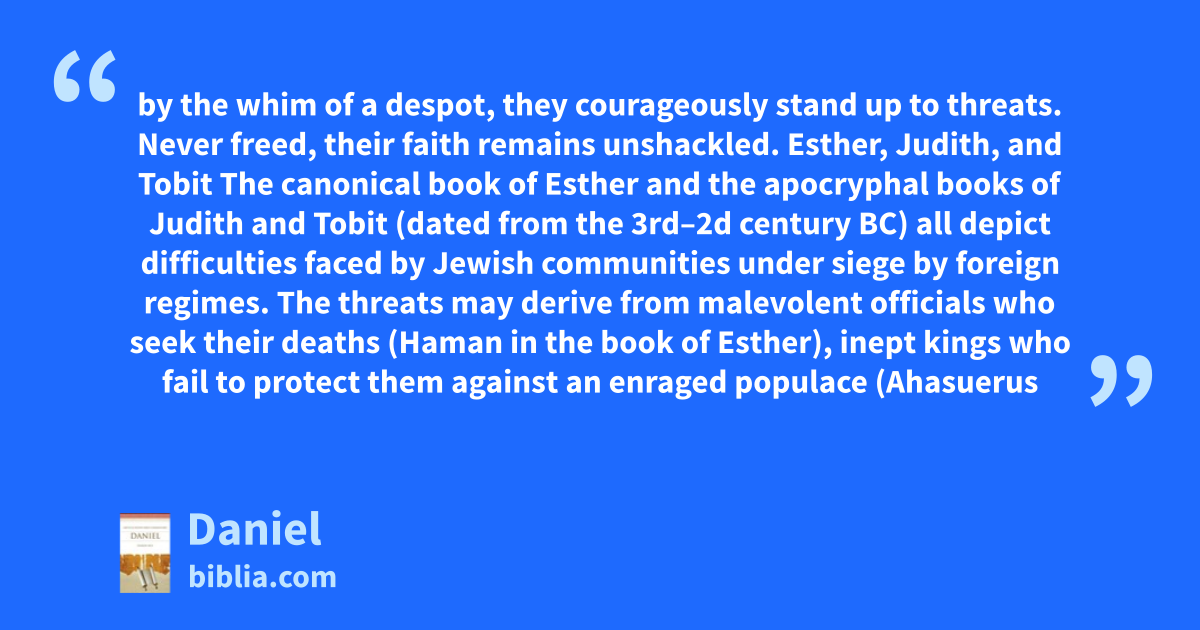 by the whim of a despot, they courageously stand up to threats. Never freed, their faith remains unshackled. Esther, Judith, and Tobit The canonical book of Esther and the apocryphal books of Judith and Tobit (dated from the 3rd–2d century BC) all depict difficulties faced by Jewish communities under siege by foreign regimes. The threats may derive from malevolent officials who seek their deaths (Haman in the book of Esther), inept kings who fail to protect them against an enraged populace (Ahasuerus