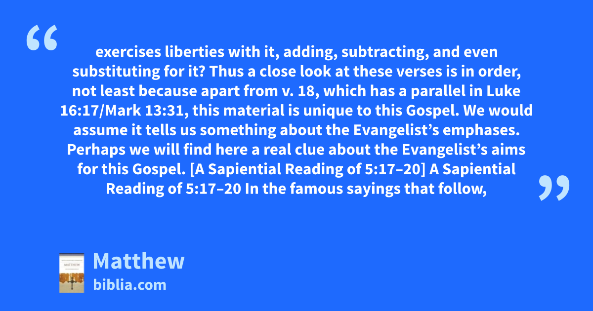 exercises liberties with it, adding, subtracting, and even substituting for it? Thus a close look at these verses is in order, not least because apart from v. 18, which has a parallel in Luke 16:17/Mark 13:31, this material is unique to this Gospel. We would assume it tells us something about the Evangelist’s emphases. Perhaps we will find here a real clue about the Evangelist’s aims for this Gospel. [A Sapiential Reading of 5:17–20] A Sapiential Reading of 5:17–20 In the famous sayings that follow,