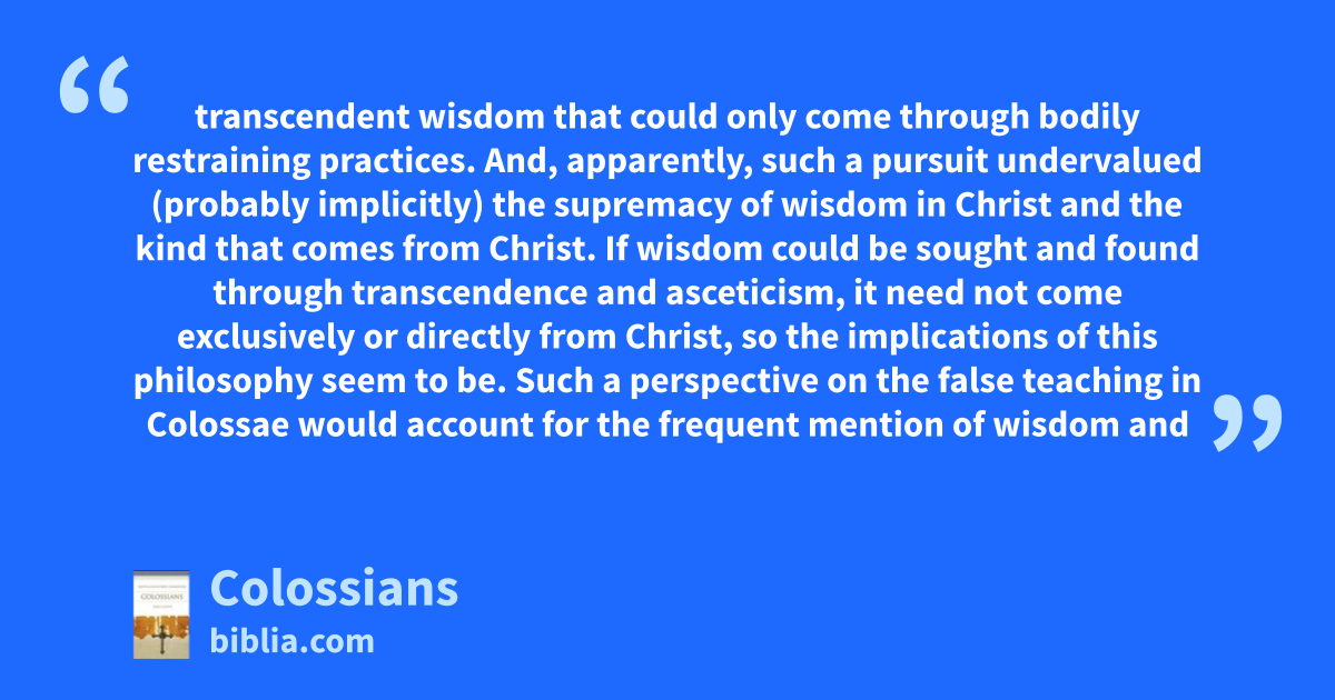 transcendent wisdom that could only come through bodily restraining practices. And, apparently, such a pursuit undervalued (probably implicitly) the supremacy of wisdom in Christ and the kind that comes from Christ. If wisdom could be sought and found through transcendence and asceticism, it need not come exclusively or directly from Christ, so the implications of this philosophy seem to be. Such a perspective on the false teaching in Colossae would account for the frequent mention of wisdom and