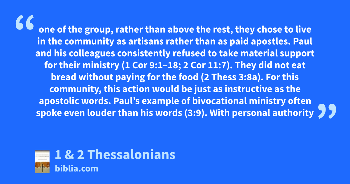 one of the group, rather than above the rest, they chose to live in the community as artisans rather than as paid apostles. Paul and his colleagues consistently refused to take material support for their ministry (1 Cor 9:1–18; 2 Cor 11:7). They did not eat bread without paying for the food (2 Thess 3:8a). For this community, this action would be just as instructive as the apostolic words. Paul’s example of bivocational ministry often spoke even louder than his words (3:9). With personal authority