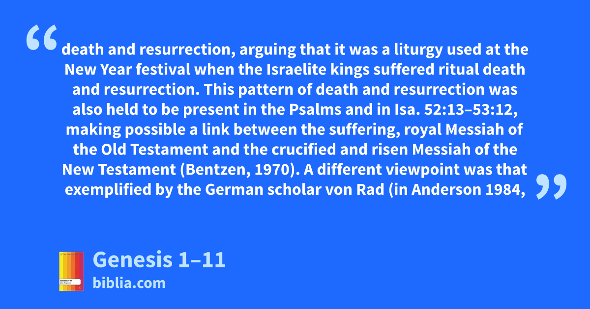 death and resurrection, arguing that it was a liturgy used at the New Year festival when the Israelite kings suffered ritual death and resurrection. This pattern of death and resurrection was also held to be present in the Psalms and in Isa. 52:13–53:12, making possible a link between the suffering, royal Messiah of the Old Testament and the crucified and risen Messiah of the New Testament (Bentzen, 1970). A different viewpoint was that exemplified by the German scholar von Rad (in Anderson 1984,