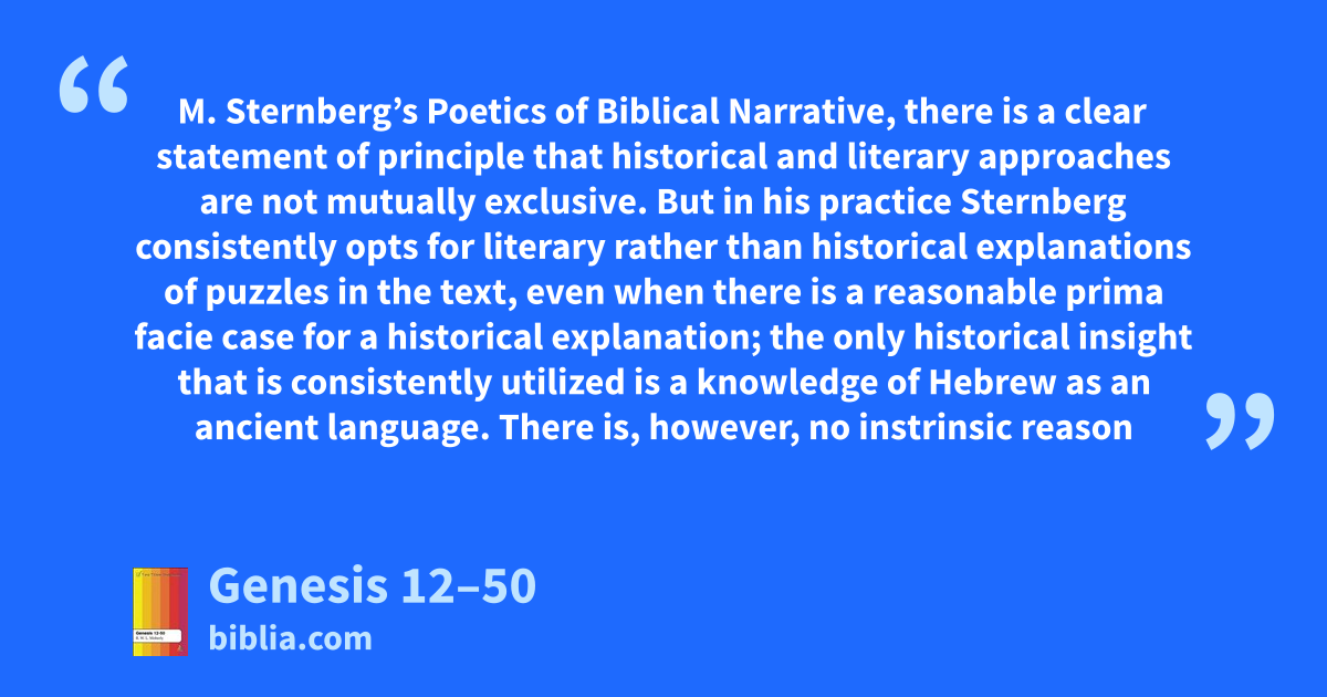 M. Sternberg’s Poetics of Biblical Narrative, there is a clear statement of principle that historical and literary approaches are not mutually exclusive. But in his practice Sternberg consistently opts for literary rather than historical explanations of puzzles in the text, even when there is a reasonable prima facie case for a historical explanation; the only historical insight that is consistently utilized is a knowledge of Hebrew as an ancient language. There is, however, no instrinsic reason