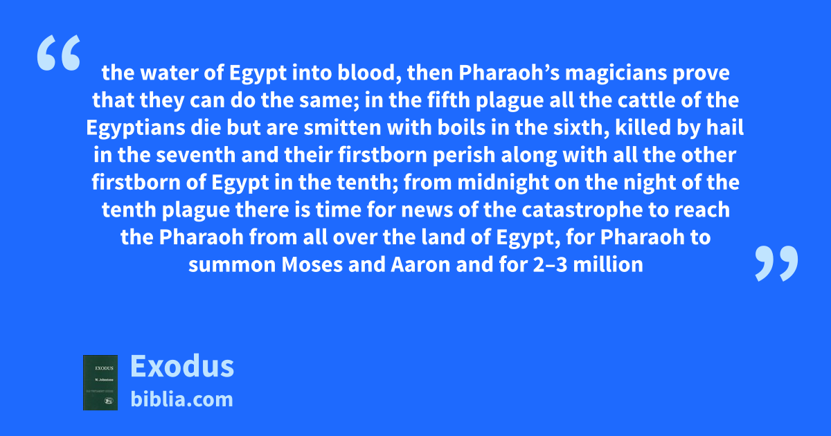 the water of Egypt into blood, then Pharaoh’s magicians prove that they can do the same; in the fifth plague all the cattle of the Egyptians die but are smitten with boils in the sixth, killed by hail in the seventh and their firstborn perish along with all the other firstborn of Egypt in the tenth; from midnight on the night of the tenth plague there is time for news of the catastrophe to reach the Pharaoh from all over the land of Egypt, for Pharaoh to summon Moses and Aaron and for 2–3 million